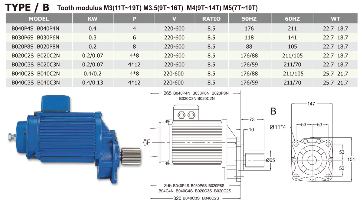 機型-B 馬力-040 (0.4KW) 極數 -P4 緩衝-S 無緩衝-N